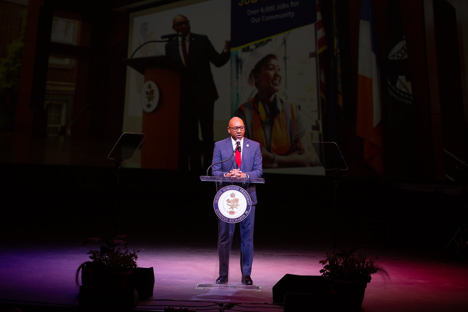 Joined by officials including Letitia James, Chuck Schumer, and Melinda Katz, Richards reflected on reducing unemployment from 25% to 5.4%, securing billions in investments, and expanding affordable housing and education funding.